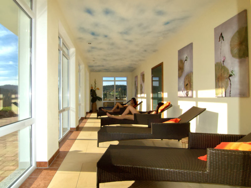 eine Saunalandschaft mit Finnischer-Sauna, Bio-Sauna, Infrarot-Sauna, und Dampfbad, eine Sonnenwiese, Ruheräume sowie ein Wintergarten mit herrlichem Ausblick.